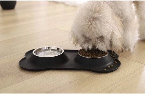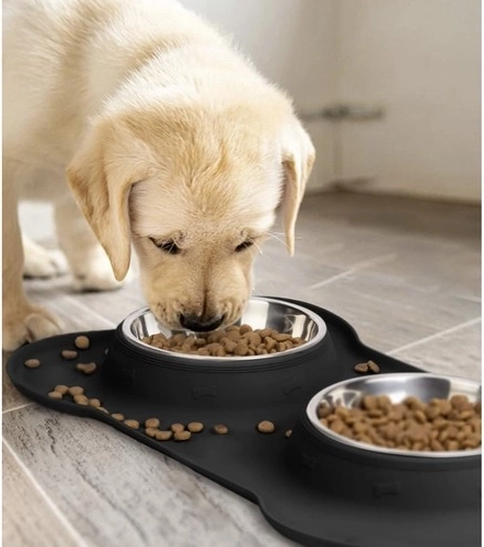 Palutiniet savu mīluli ar ērtu un tīru barošanu. Divas nerūsējošā tērauda bļodas ar tilpumu 2 × 450 ml ievietotas elastīgā silikona paliktnī, kas notur izlijušu ūdeni un izbirstošu barību. Kaula formas paliktnim ir paaugstināta mala un neslīdoša apdare, tāpēc tas paliek savā vietā pat ļoti aizrautīgas mielošanās laikā.
