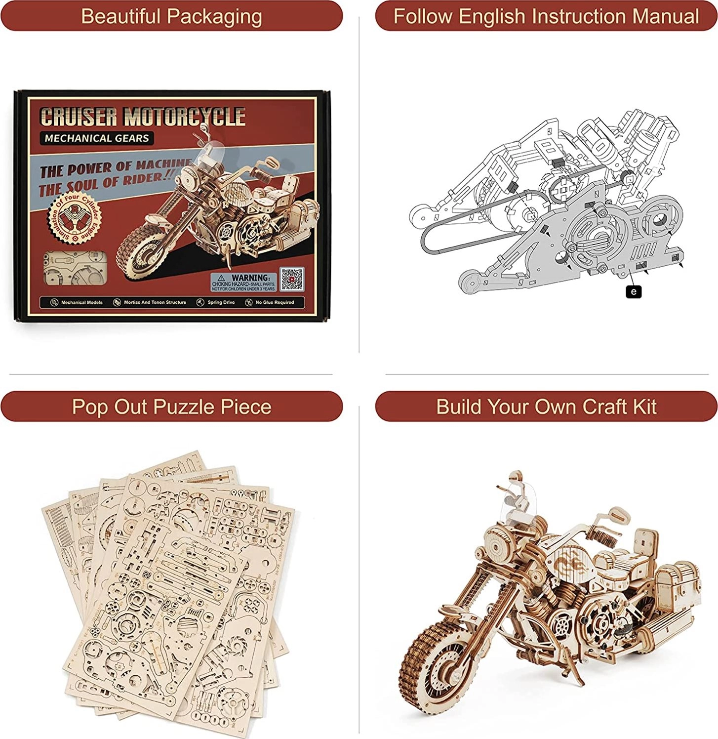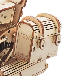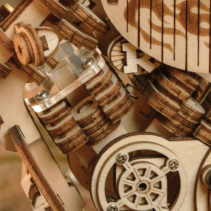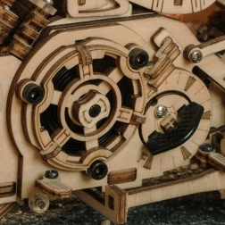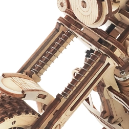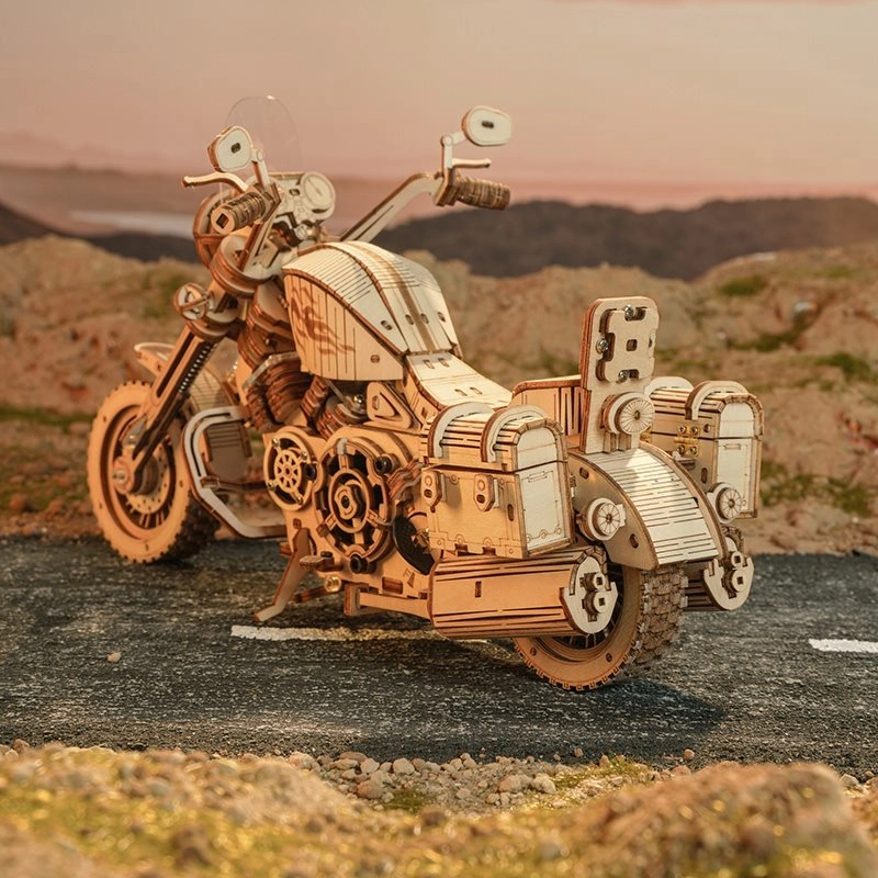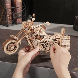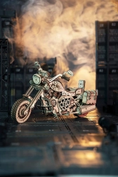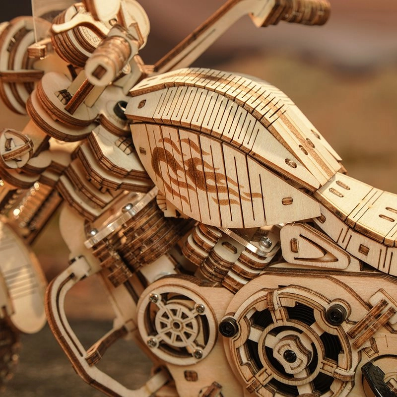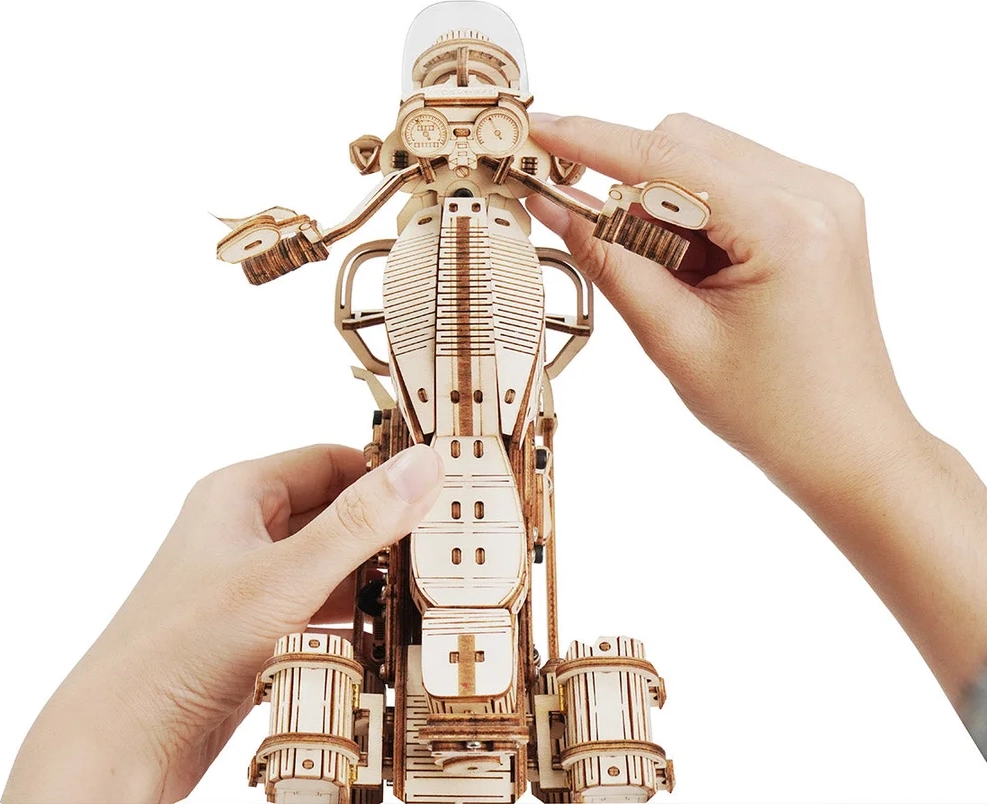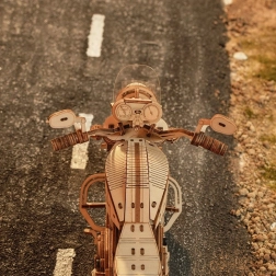 Šis koka mehāniskais motocikls ir lieliska izvēle ikvienam, kurš mīl dizainu, tehniku un rūpīgu roku darbu. Uzvilkams atsperes mehānisms ar sprūdu iedarbina modeli raitā braucienā, savukārt darbojošā stūre ļauj daļēji vadīt virzienu. Reālistisko motora darbību lieliski papildina virzuļu kustība un funkcionāla priekšējās dakšas piekare.