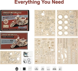 Atklājiet modelēšanas prieku ar šo precīzo 3D motocikla saplākšņa komplektu. Modelim ir uzvilkams atsperes piedziņas mehānisms, darbojoša stūrēšana, kustīgi virzuļi un strādājoša priekšējā piekare. Pateicoties 420 detaļām un vidējam sarežģītības līmenim, jūs gaida 4–5 stundas jautrības; pēc salikšanas motocikls spēj braukt patstāvīgi un izceļas ar dekoratīvu izskatu un mazām glabāšanas nodalījumu kastītēm pie sēdekļa.