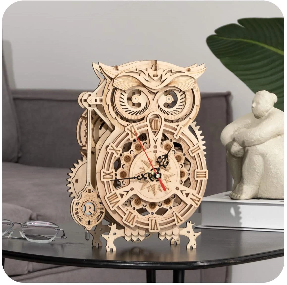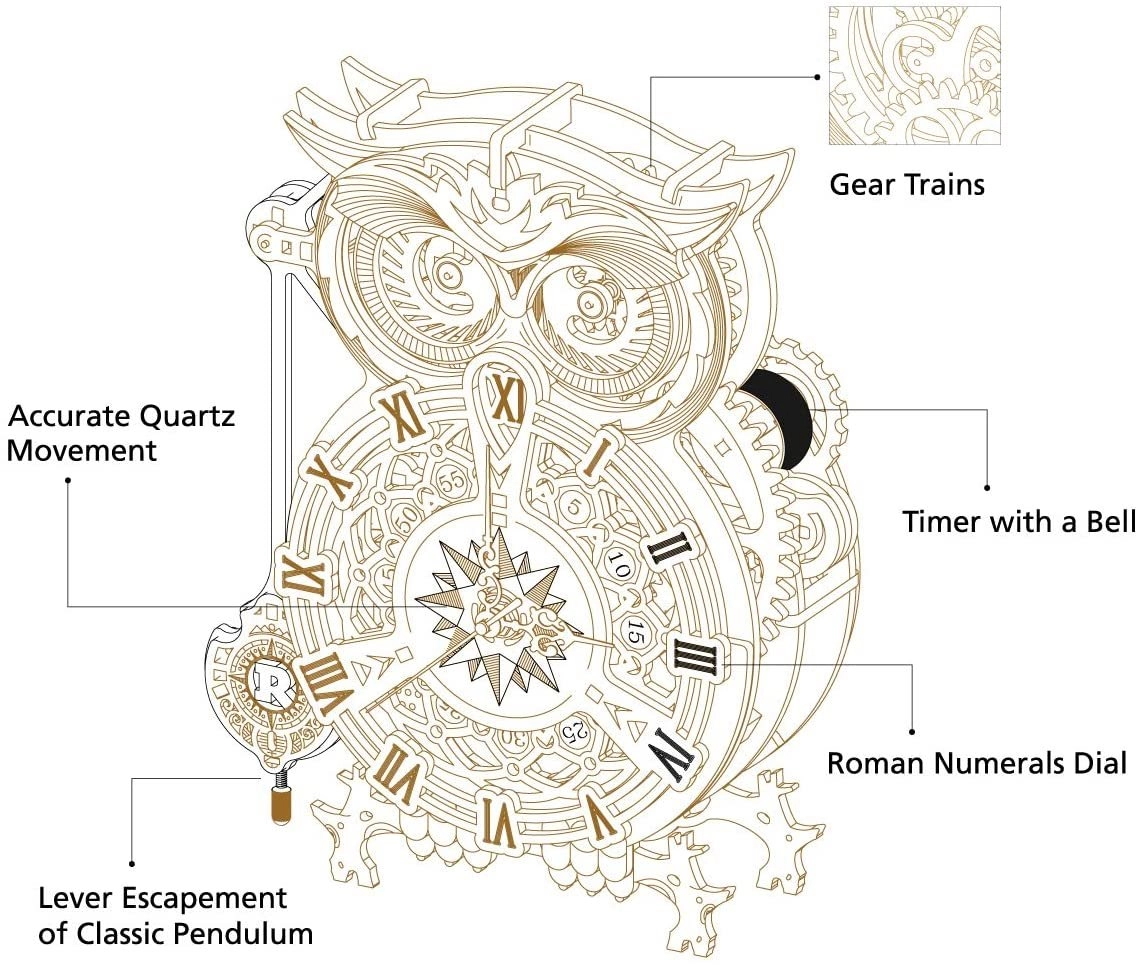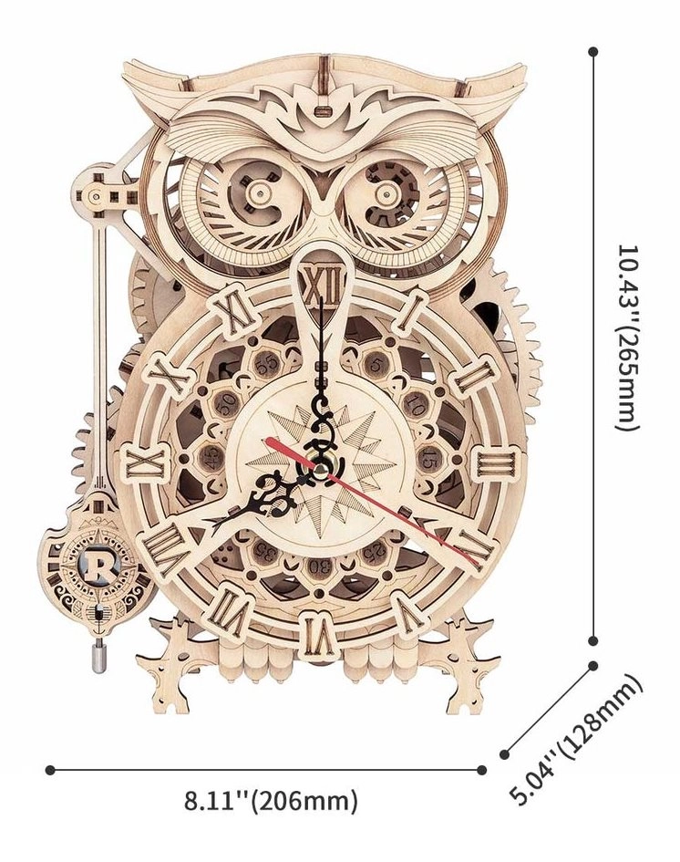 Elegantais 3D koka pūču pulkstenis piedāvā ne tikai skaistu dizainu, bet arī pilnībā funkcionālu mehānismu, ko darbina elektriska sistēma. Ideāli piemērots DIY entuziastiem un kā grezna dekorācija.