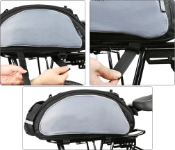 Gumijas pieturas uz atloka ļauj droši ievietot jaku vai pudeli, savukārt atstarojošās svītras uzlabo jūsu drošību uz ceļa. Universāls dizains der lielākajai daļai velosipēdu bagāžnieku, un pateicoties regulējamām sprādzēm uzstādīšana ir ātra un vienkārša.