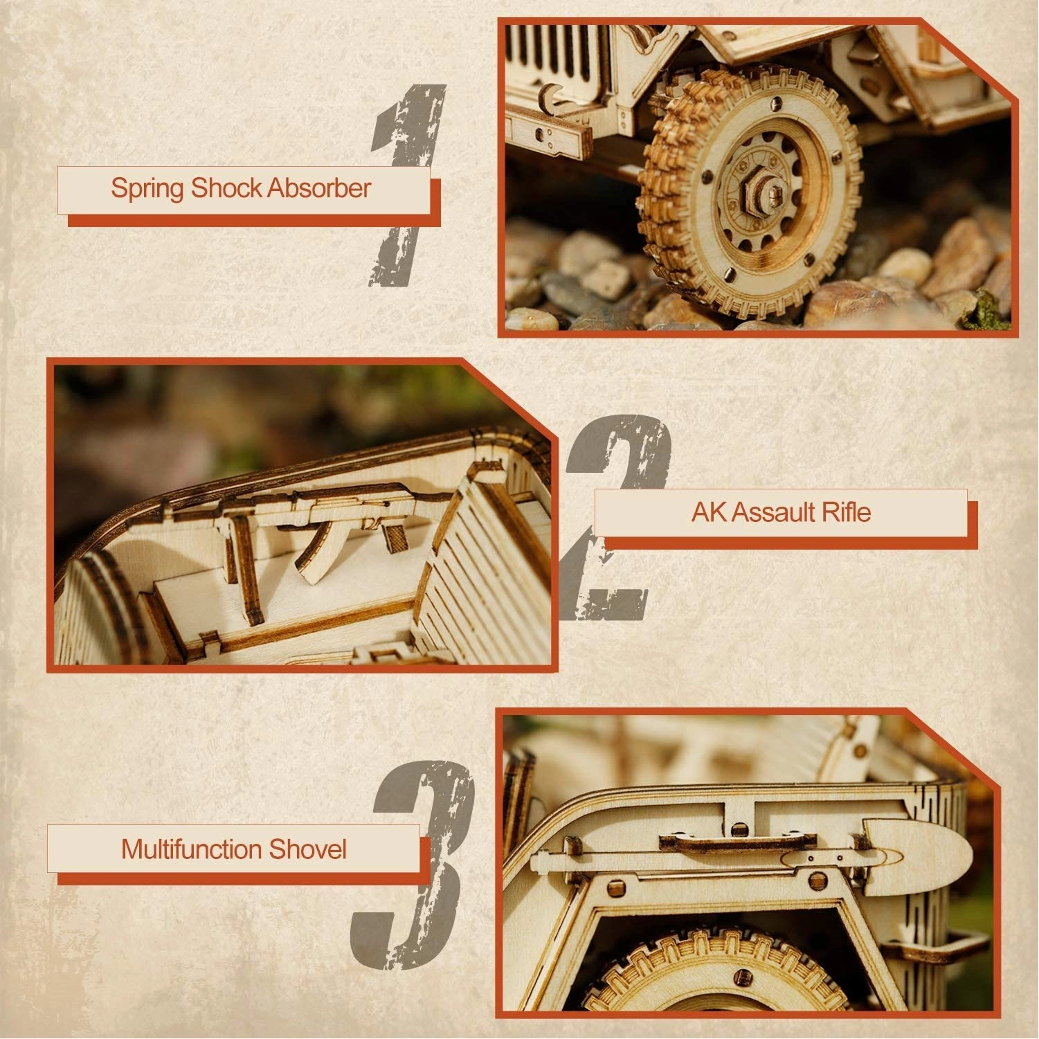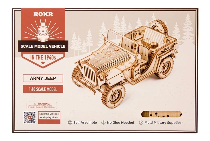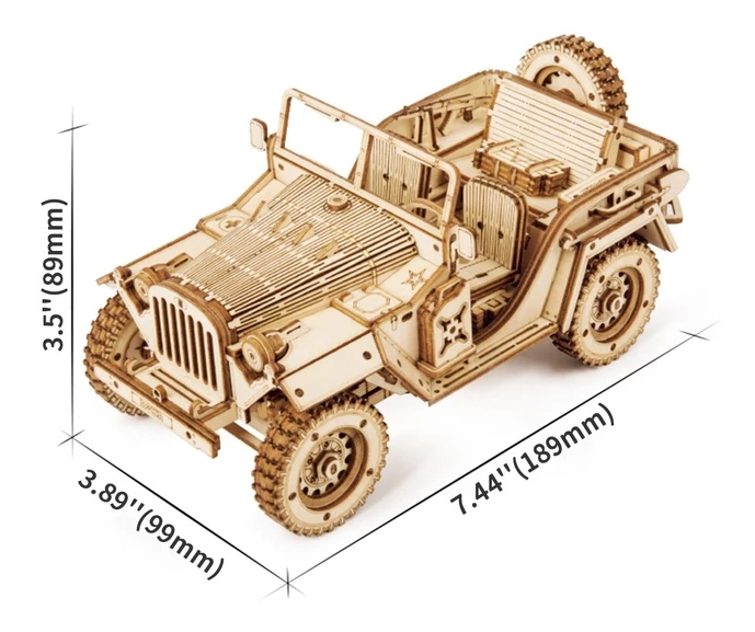 Reālistisks koka militārā džipa modelis no 20. gadsimta 40. gadiem ir ideāli piemērots modeļu cienītājiem. Šī koka 3D puzle ar 369 detaļām piedāvā īstas detaļas un izaicinājumu tehnoloģiju entuziastiem.