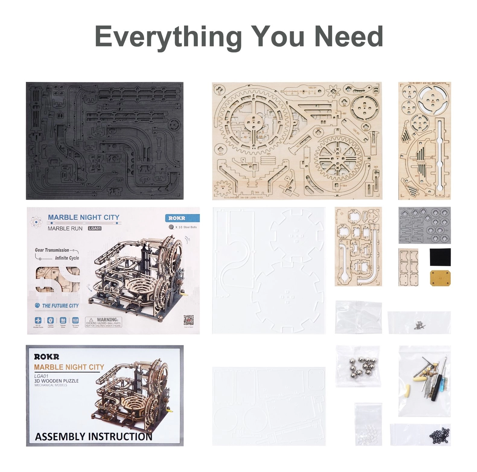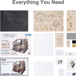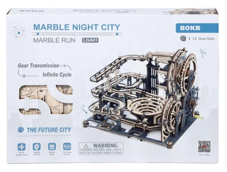 ROKR Marble Night City ir iespaidīgs 3D saliekamais lodīšu trases modelis, kas apvieno izklaidi un izglītošanu. Modelis sastāv no 294 precīzi izgrieztām detaļām, kas veido sarežģītu trasi ar dažādiem šķēršļiem un ar roku darbinātu mehāniku, griežot kloķi. Iepakojumā iekļauta pilna rokasgrāmata, kas palīdzēs montāžas procesā.