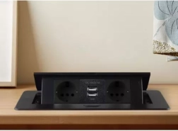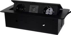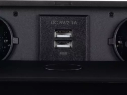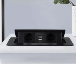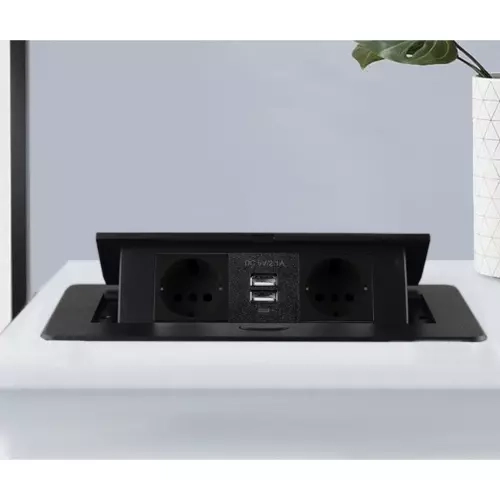 Elegants iebūvējams barošanas risinājums galdiem, virtuves virsmām un konferenču telpām: modulis ar 2 Schuko kontaktligzdām un 2 USB (5 V/2,1 A) izturīgā metāla korpusā. Pateicoties diskrētam izvelkamam mehānismam, tas paliek paslēpts, kad to neizmantojat, un ar plakanu rāmi perfekti līdzinās virsmai. Nodrošina uzticamu jaudu līdz 3300 W un ātru uzlādi tālruņiem un piederumiem.