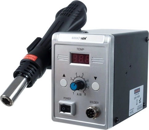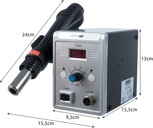 Stacija ļauj iestatīt temperatūru no 100 °C līdz 500 °C un regulēt gaisa plūsmu, kas ir ideāli piemērots dažādiem uzdevumiem, tostarp smalkai lodēšanai vai plastmasas locīšanai.