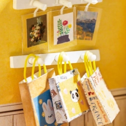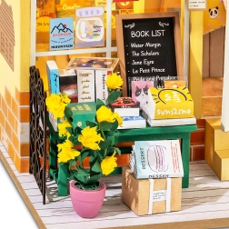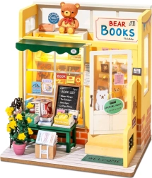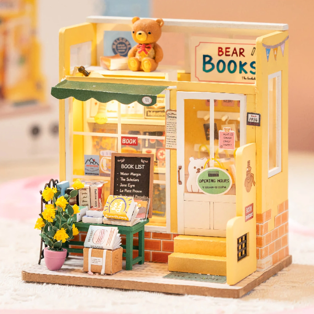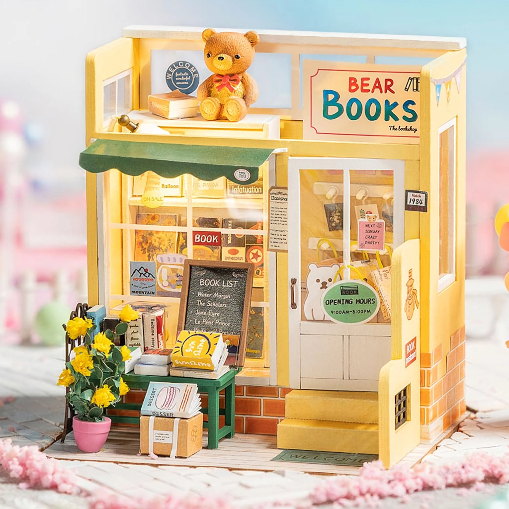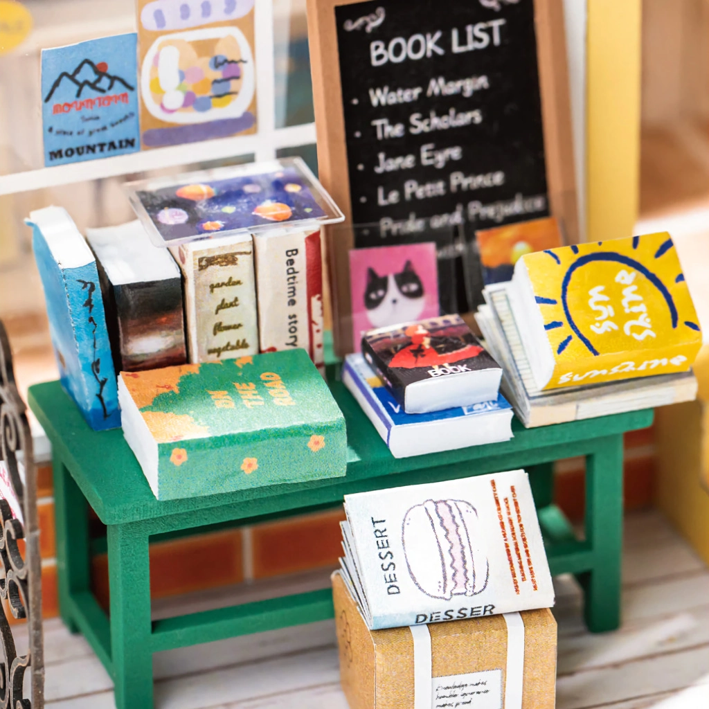 Plaukti ar grāmatām, mīlīgs lācītis, puķes un aksesuāri – katra nianse veido reālistisku un apburošu mini grāmatnīcas izskatu.