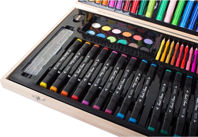 Komplekts ir rūpīgi sakārtots izturīgā koka futrālī, kas nodrošina ērtu pārnesamību un kārtību. Katram rīkam ir sava vieta, tādēļ vairs nepazudīs jūsu iemīļotā krītiņa. Pabeidzot mākslas darbus, vienkārši visu sakārtojiet un novietojiet atpakaļ futrālī.