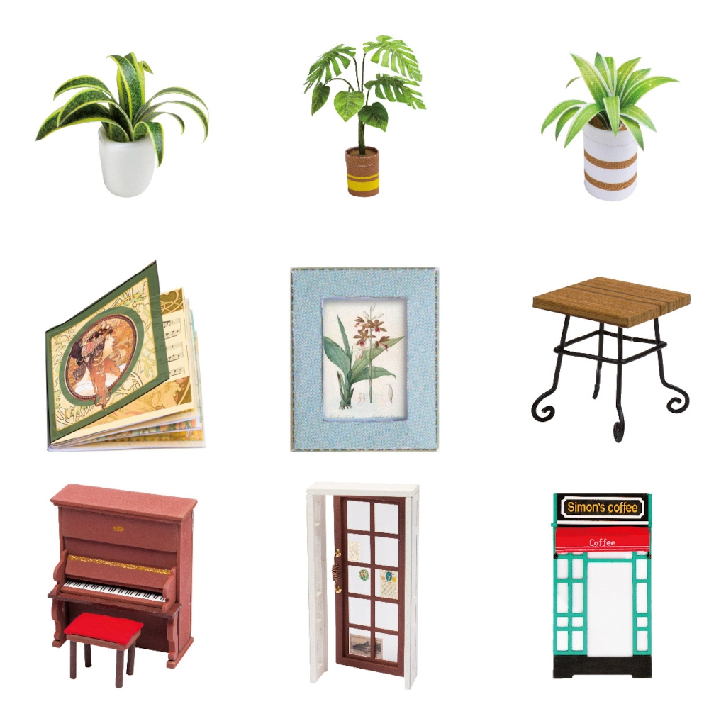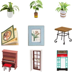 No mēbelēm un augiem līdz pat klavierēm – komplekts ietver daudz miniatūru elementu maksimālai autentiskumam.