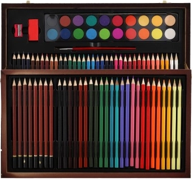 Radošais mākslas komplekts ir lielisks risinājums ikvienam, kurš mīl radīt. Pateicoties praktiskajam koka futrālim, visas piederības ir pārskatāmi sakārtotas un vienmēr gatavas lietošanai.