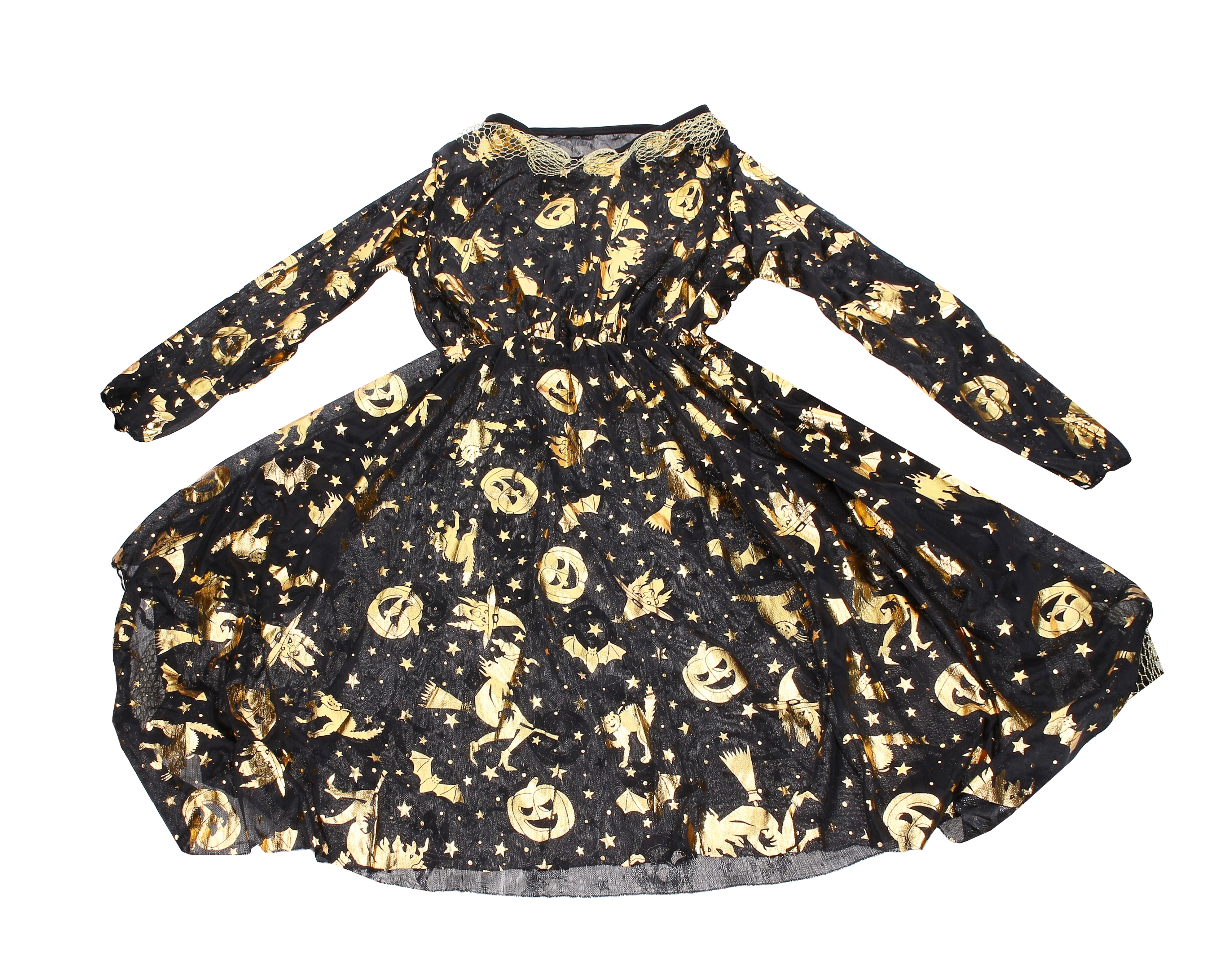 Pārvērtieties pasaku raganā ar zelta kostīmu, kas piesaista uzmanību no pirmā acu uzmetiena. Šis raganas karnevāla kostīms ietver kleitu un cepuri un lieliski der karnevālam, masku ballēm un Helovīnam.