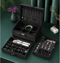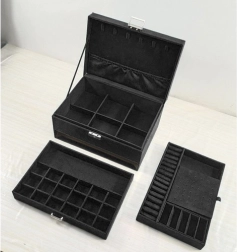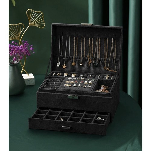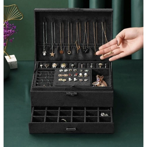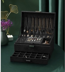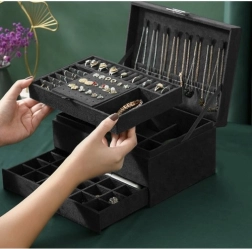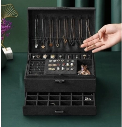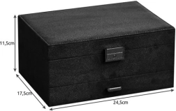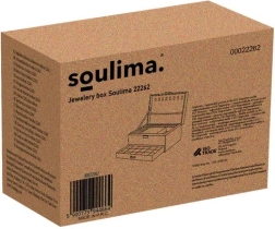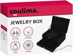 Stilīga un praktiska SOULIMA rotaslietu kastīte elegantā melnā krāsā nodrošina ideāli pārskatāmu rotaslietu glabāšanu mājās un ceļā. Tai ir vairākas pakāpes un dažādi nodalījumi gredzeniem, auskariem, kaklarotām, rokassprādzēm un pulksteņiem, slēgšana ar atslēgu paaugstinātai drošībai un mīksta samta virsma, kas aizsargā no skrāpējumiem un putekļiem.