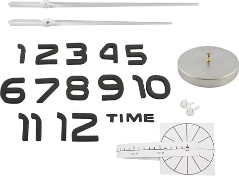- 3D cipari un uzraksts, spoguļuzlikas, pulksteņa mehānisms ar rādītājiem, papīra montāžas šablons, āķi