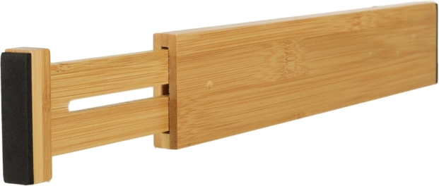 Izbaudiet perfektu kārtību ar praktisku atvilktnes organizatoru, kas ļauj viegli sakārtot visas jūsu lietas. Atskirstiet dažādus priekšmetus pat vienā atvilktnē un izbaudiet estētisku izskatu, pateicoties bambusa materiālam. Organizators ir ideāli piemērots virtuvei, vannas istabai vai drēbju skapim, ar regulējamu garumu no 34 līdz 43,5 centimetriem, lai tas perfekti ietilptu jūsu atvilktnēs.