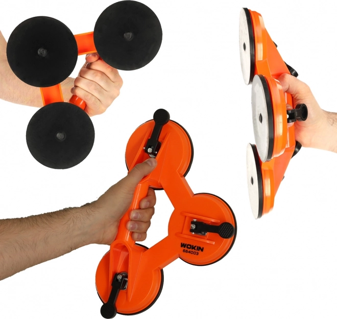 Profesionāls WOKIN trīskāršais vakuuma piesūceknis ar nestspēju 75 kg atvieglo drošu stikla, glazūras un liela formāta flīžu pārvietošanu un pozicionēšanu. Trīs piesūces punkti ar 11,5 cm diametru nodrošina stabilu satvērienu bez virsmas skrāpējumiem, bet ergonomiskā roktura forma ļauj precīzi manipulēt un paaugstina darba komfortu.