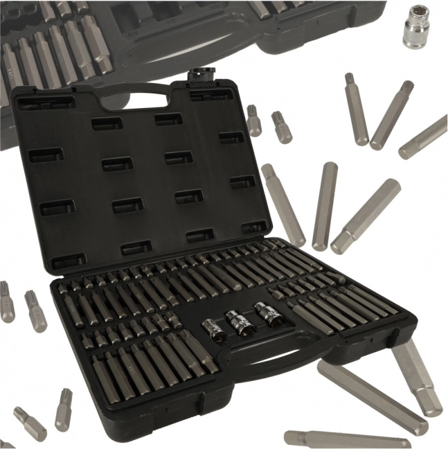 Ar šo visaptverošo bitu komplektu iegūsiet visu nepieciešamo dažādu savienojumu skrūvēšanai un atskrūvēšanai auto, mehāniskajā un mājsaimniecības jomā. Biti no hroma–vanādija tērauda CrV nodrošina augstu ilgmūžību, precīzu sēšanos un uzticamu spēka pārnesi. Komplektā atradīsiet īsus un garus bitus plašā izmēru spektrā, kā arī 1/2" un 3/8" redukcijas maksimālai saderībai ar instrumentiem.