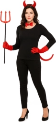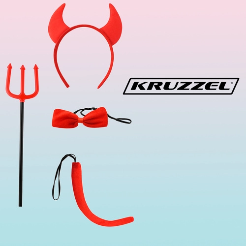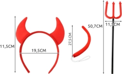 Pilns velniņa kostīms bērniem un pieaugušajiem ar 4 aksesuāriem: ragi uz stīpiņas, tauriņš, aste un trijžuburis. Universāls izmērs ar elastīgām gumijām nodrošina ērtu valkāšanu. Lieliska izvēle Helovīnam, karnevāliem, dzimšanas dienu ballītēm vai tematiskiem pasākumiem – izveidojiet pamanāmu un jautru kostīmu dažu mirkļu laikā.
