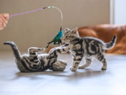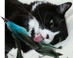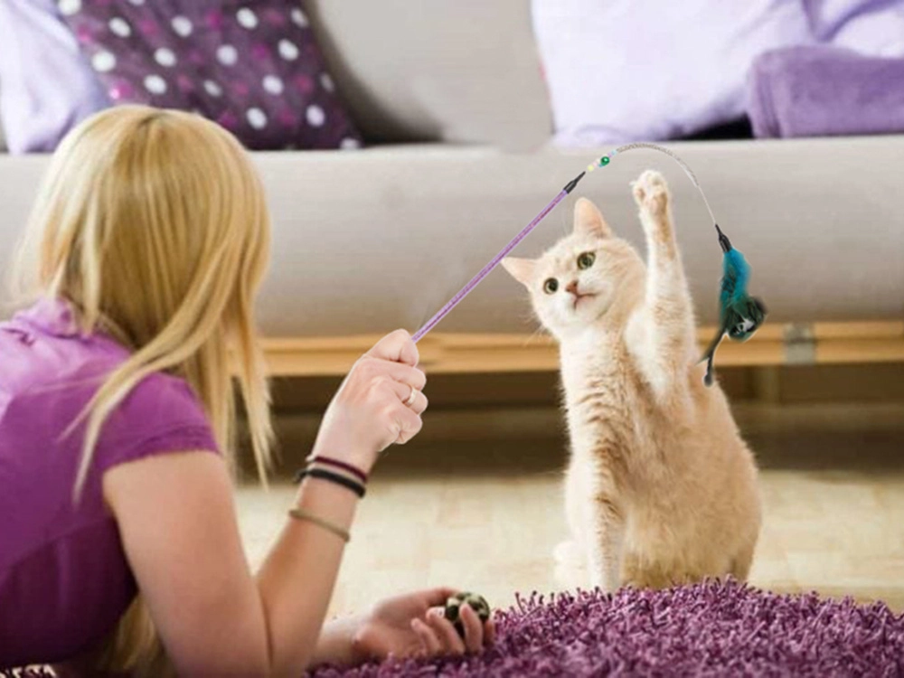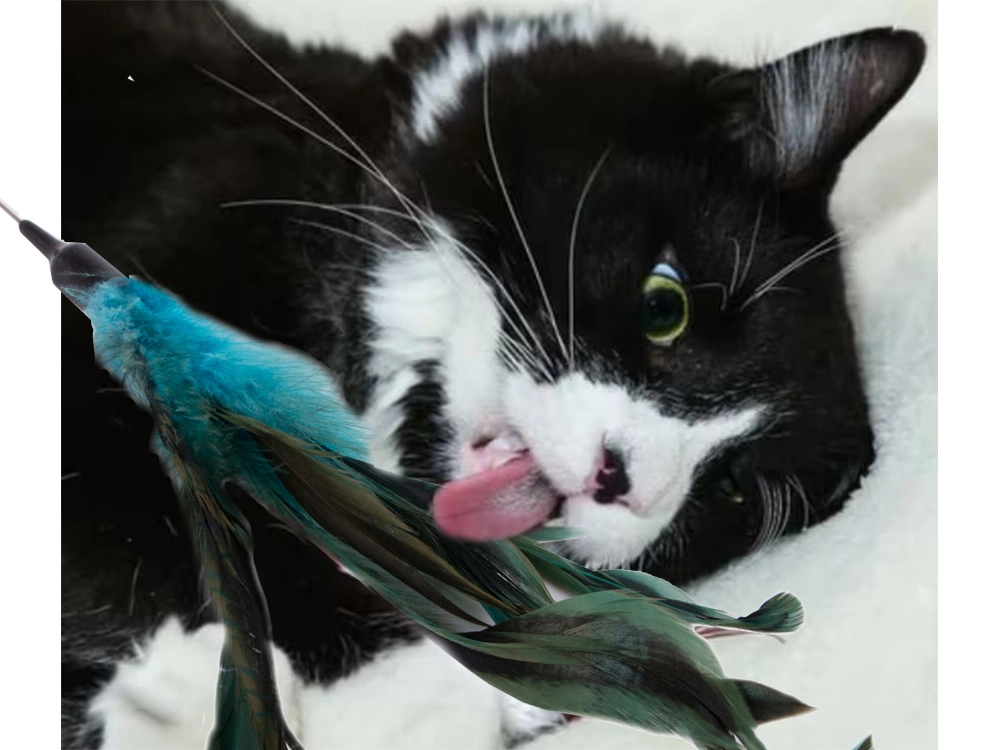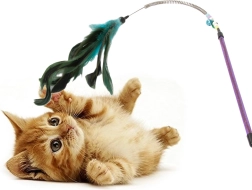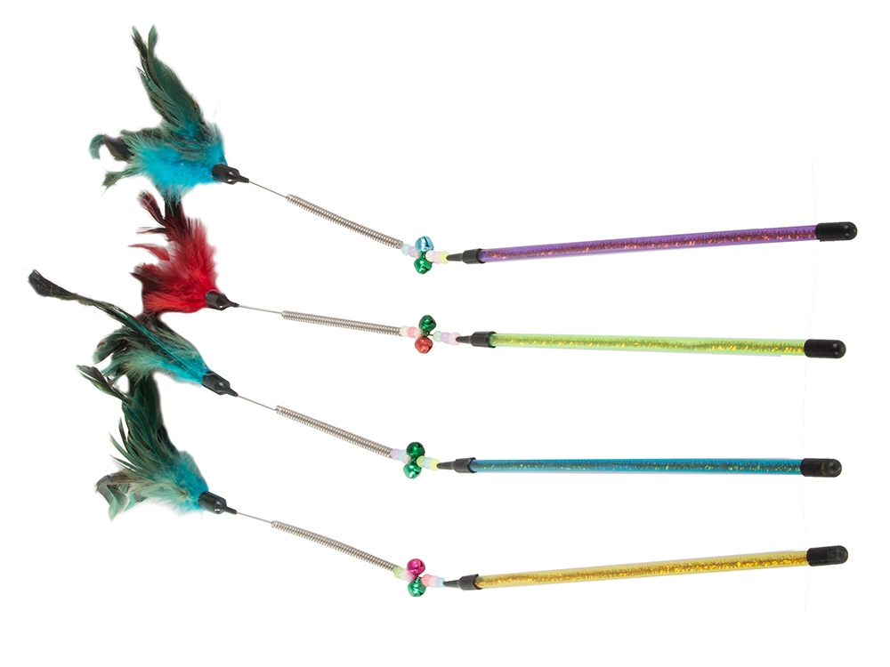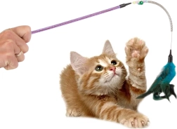 Krāsainās spalviņas ir mīkstas un aicina kaķus uz mijiedarbību.