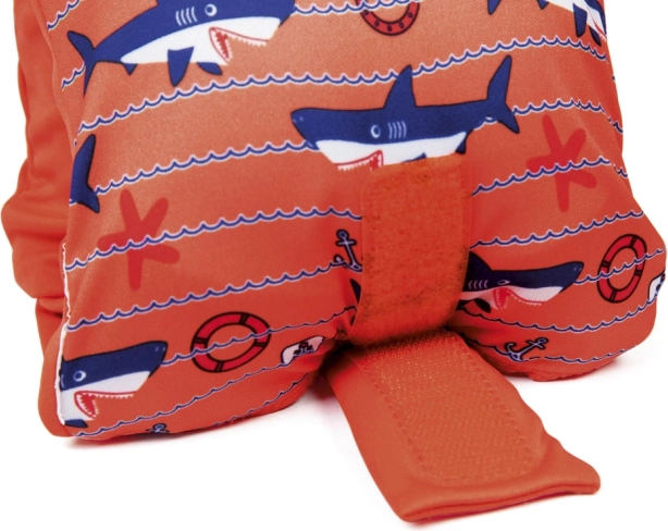 Košais oranžais noformējums ar jautrām haizivīm veicina bērnu vēlmi pavadīt laiku ūdenī un uzlabo redzamību.