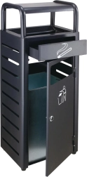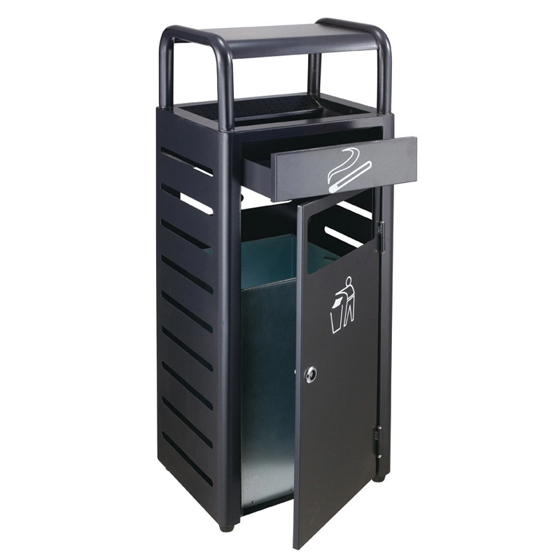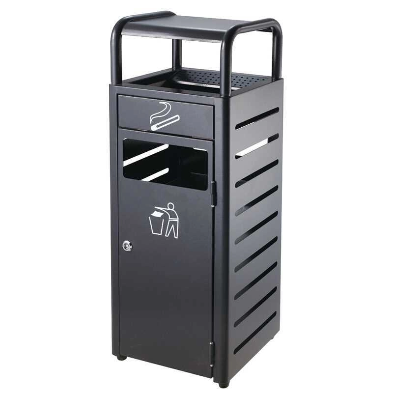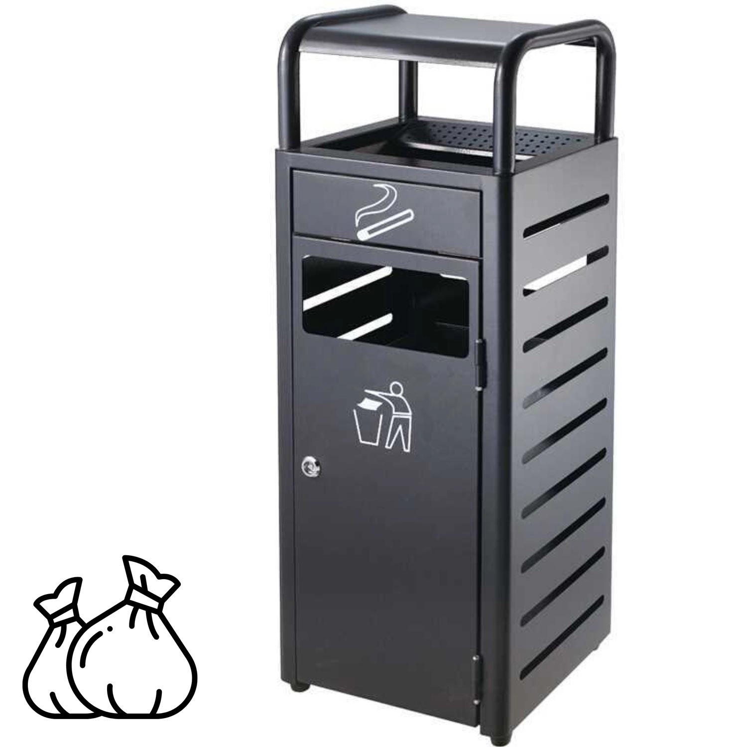 Šī atkritumu tvertne ar pelnu trauku apvieno funkcionalitāti un estētiku. Izgatavota no augstas kvalitātes nerūsējošā tērauda ar sudrabotu virsmu un melnu dizainu, tā ir izturīga ikdienas lietošanā un viegli kopjama. Augšējā daļā ir praktiska iedobe izsmēķu novietošanai, kas palīdz uzturēt apkārtni tīru un drošu.