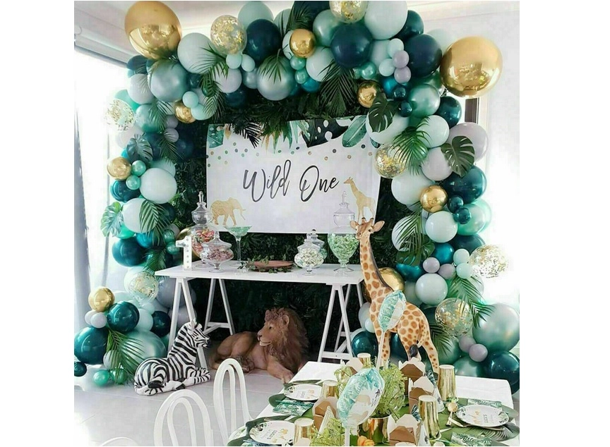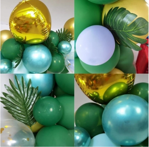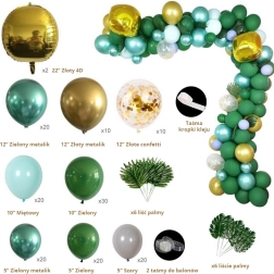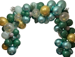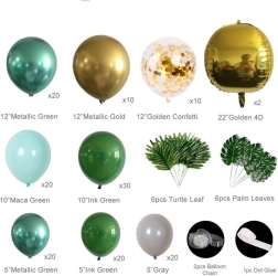 Izveidojiet mājās vai svinībās iespaidīgu dekoru ar šo lielo balonu virteni zaļos un zeltainos toņos. Komplektā ir dažādi izmēri, konfeti baloni un tropu lapas svaigam džungļu efektam. Balonus var pūst ar gaisu vai hēliju un tos viegli savienot, izmantojot lenti ar cilpiņām, lai izveidotu kuplu, lokveida dekorāciju.