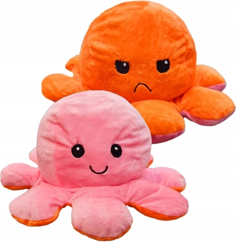 Šis divpusējais plīša astoņkājis ir ideāls sabiedrotais gan bērniem, gan pieaugušajiem. Ar vienkāršu apgriešanu acumirklī pārslēdziet izteiksmi no smaidīgas uz bēdīgu vai saniknotu un vienlaikus mainiet krāsu no rozā uz oranžu. Ļoti mīkstais materiāls aicina uz mīļošanu un lieliski der arī kā pretstressa rotaļlieta.
