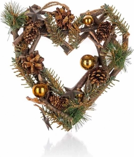 Elegants Ziemassvētku vainags sirds formā ar 24 cm diametru brūni zeltainā noformējumā piešķirs interjeram svētku noskaņu. Pateicoties mūžīgam dizainam, kvalitatīviem materiāliem un integrētai piekarei, tas ir ideāli piemērots durvīm, sienai un arī kā galda centrālā dekorācija.