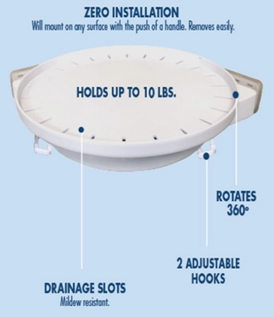 Plaukts griežas par 360°, tāpēc ātri atradīsiet, kas nepieciešams. Uzstādīšana aizņem tikai mirkli – bez urbšanas un instrumentiem, pietiek nospiest spiedroga rokturi un novietot tur, kur vēlaties maksimāli izmantot katru centimetru. Integrētie āķi nodrošina papildu vietu dvieļu, dvieļlaužu vai vannas sūkļu iekarināšanai.