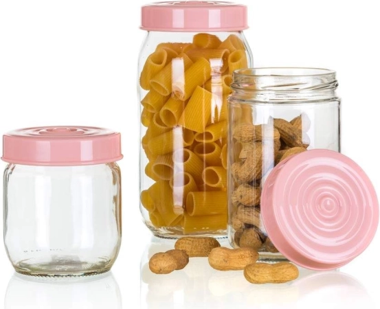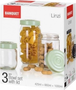 Praktisks trīs stikla kārbu komplekts LINZI ar tilpumiem 425 ml, 660 ml un 1000 ml pārskatāmai pārtikas uzglabāšanai. Stikla trauki ar plastmasas vāciņiem rozā krāsā nodrošina ciešu noslēgšanu un ilgāku svaigumu saturam – ideāli makaroniem, cukuram, riekstiem vai garšvielām. Kvalitāte un stils no zīmola BANQUET jebkurai virtuvei.