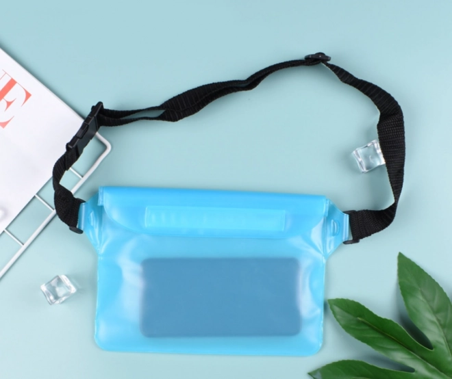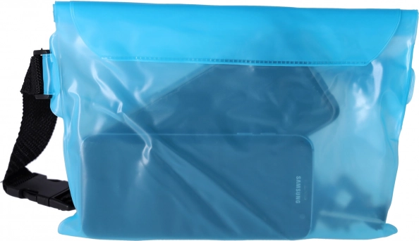 Praktiska un stilīga ūdensizturīga soma gaiši zilā krāsā pasargā jūsu tālruni, dokumentus, atslēgas un skaidru naudu no ūdens un smiltīm. Pateicoties caurspīdīgajam materiālam, tā ļauj izmantot skārienekrānu, tai ir regulējama siksna un drošs aizdare ar līplenti. Ideāli piemērota pludmalei, baseinam un ūdens sporta veidiem.