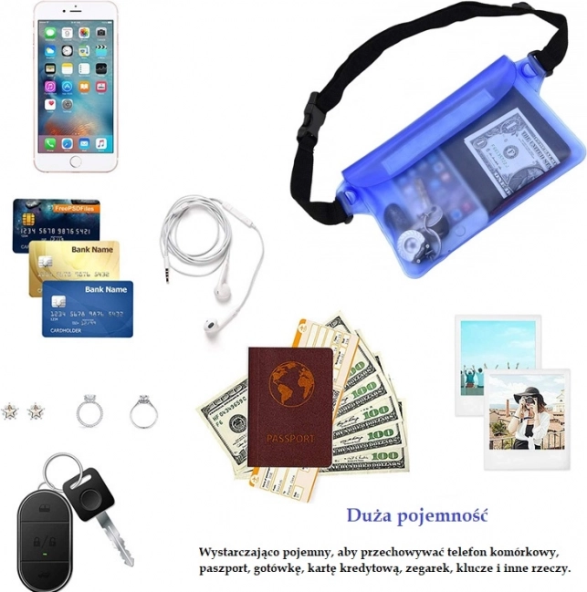 - Ūdensizturīga aizsardzība tālrunim, dokumentiem, atslēgām un skaidrai naudai