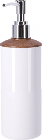 Moderns dozators ar tīri baltu korpusu un koka akcentu nodrošina precīzu un ekonomisku šķidro ziepju dozēšanu. To ir viegli uzpildīt, un tas lieliski saskaņojas ar pārējiem komplekta elementiem.