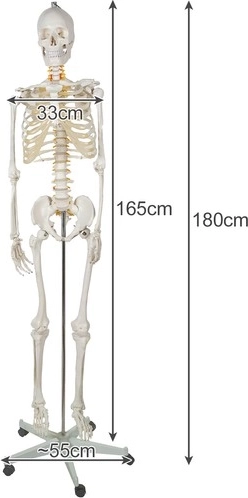 Skeleta modelis ir 165 cm bez stenda un 180 cm ar pievienotu stendu, kas atbilst pieauguša cilvēka reālistiskam izmēram.
