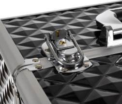 Melna un sudrabota metāla kombinācija ar ģeometriskiem rakstiem piešķir koferim modernu izskatu un vienlaikus nodrošina tā izturību.
