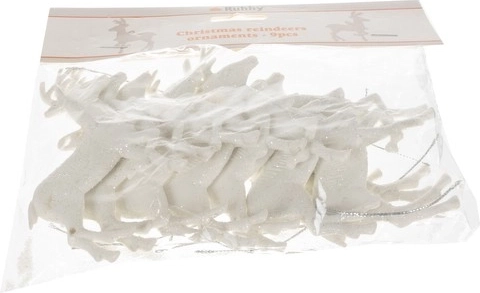 Pievienojiet savai Ziemassvētku eglītei apburošu mirdzumu ar šiem ziemeļbrieža formas rotājumiem. Komplektā iekļauti 9 eleganti apstrādāti ziemeļbrieži, katrs pārklāts ar mirdzošu virsmu.