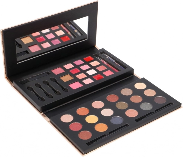Elegantā izvelkamā palete Glam To Go kompaktā dizainā piedāvā visu pilnīgam grimumam ceļā un mājās: 18 acu ēnas, 12 krēmveida lūpu krāsas, vaigu sārtumu, bronzas pūderi, acu un konturēšanas zīmuli, aplikatoru un integrētu spogulīti. Dermatoloģiski testēts un atbilst stingriem ES standartiem.
