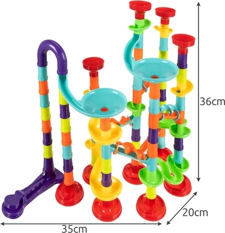 Uzbūvējiet savu 3D bumbiņu trasi ar līdz pat 113 detaļām un ļaujiet 30 bumbiņām sacensties pa krāsainiem tobogāniem, piltuvēm un rampām. Detaļas viegli un intuitīvi savienojas, tāpēc bērni var ātri mainīt maršrutus un attīstīt radošumu, telpisko domāšanu un sīkās motorikas prasmes.