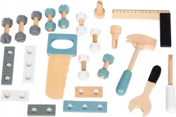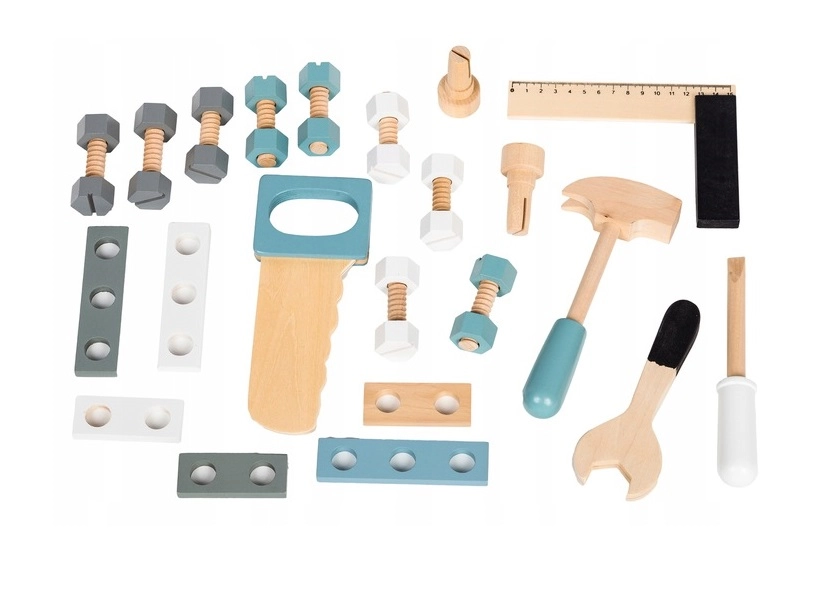 Līdz pat 32 koka detaļām – instrumenti, skrūves, uzgriežņi un savilcēji – bezgalīgām būvēšanas un rotaļmācīšanās iespējām.