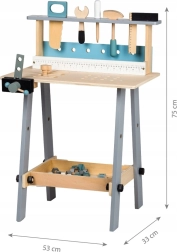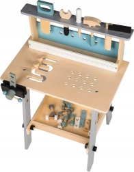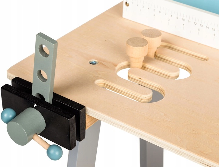 Komplektā ietilpst arī praktiska skrūvspīle, darba virsma ar atverēm un mērliktni, kā arī plaukts instrumentu glabāšanai. Dabīgā koka un klusināto toņu kombinācija iederas jebkurā bērnistabā un veicina radošas un atdarināšanas spēles.