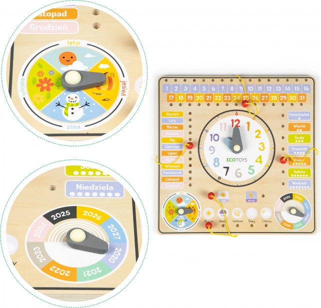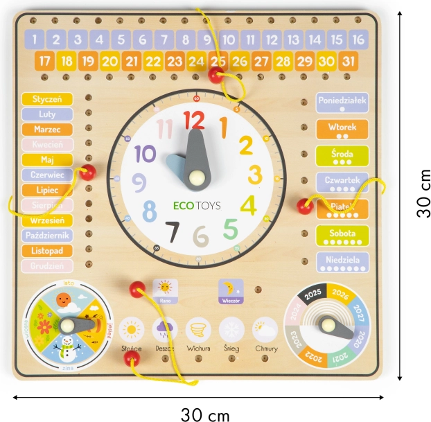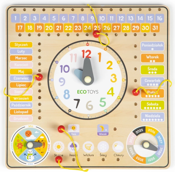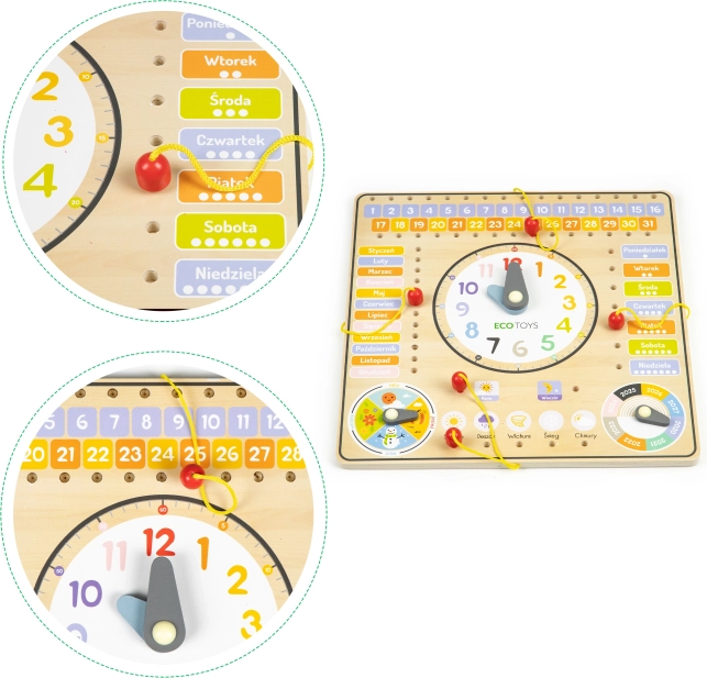 Ļaujiet bērniem atklāt pasauli ar šo krāsaino un drošo koka tāfeli. Tā māca atpazīt nedēļas dienas, dienu secību un mēnešu periodus. Ar speciālu lodziņu palīdzību bērni var atzīmēt dienas kalendārā, izmantojot aukliņu un koka knaģi.