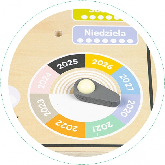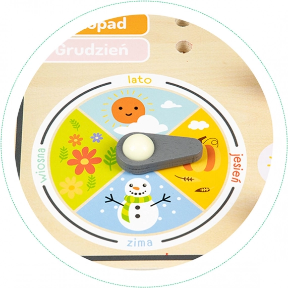 Tāfele satur poļu nosaukumus, tomēr tā ir ideāli piemērota arī latviešu bērniem, pateicoties vieglai saprotamībai un izturīgajai koka konstrukcijai. Rotaācijas rādītājs palīdz labāk izprast gadalaiku daudzveidību. Uz tāfeles iespējams atzīmēt arī gadu diapazonā no 2020 līdz 2027.