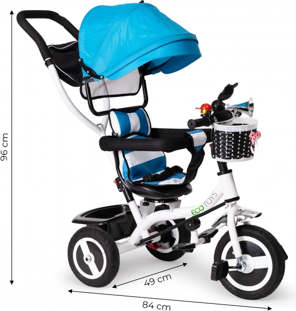 ECOTOYS bērnu trīsritenis ir paredzēts bērniem no 12 mēnešu vecuma, piedāvā komfortu un drošību pateicoties mīkstam atzveltnes spilvenam un jumtiņam, kas aizsargā no saules un lietus. Rāmis ar grozāmu sēdekli vecākiem atvieglo bērna iesēdināšanu.