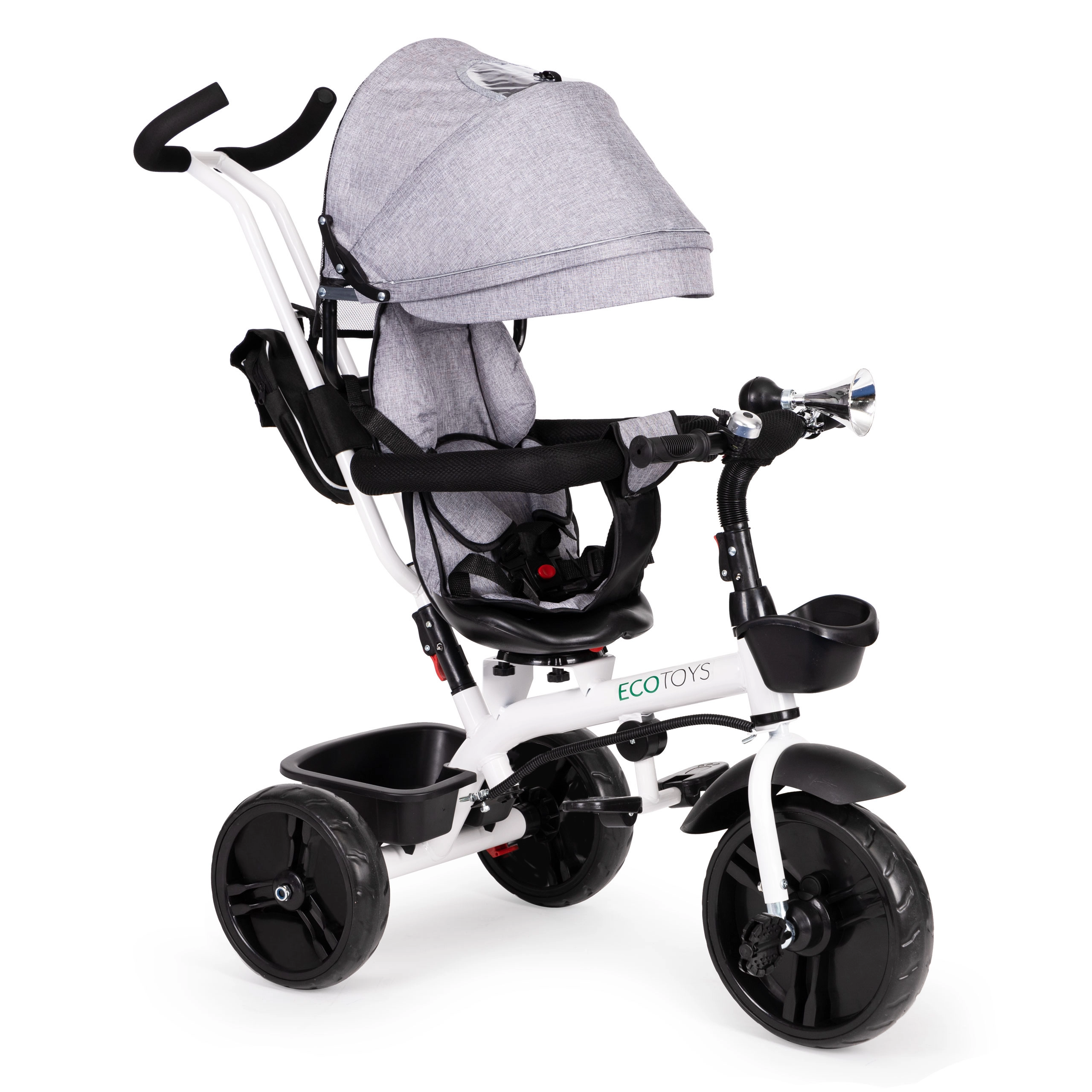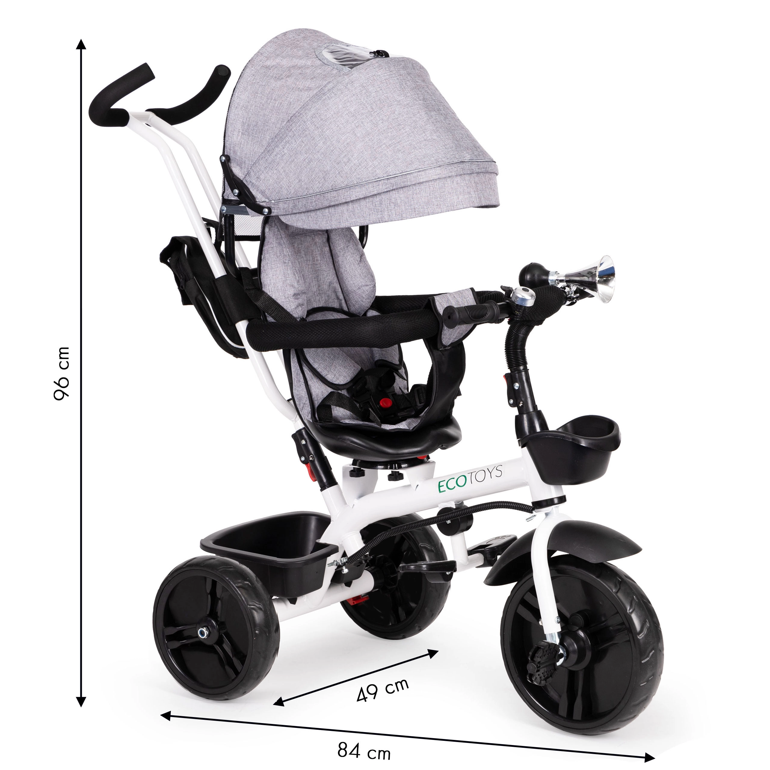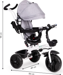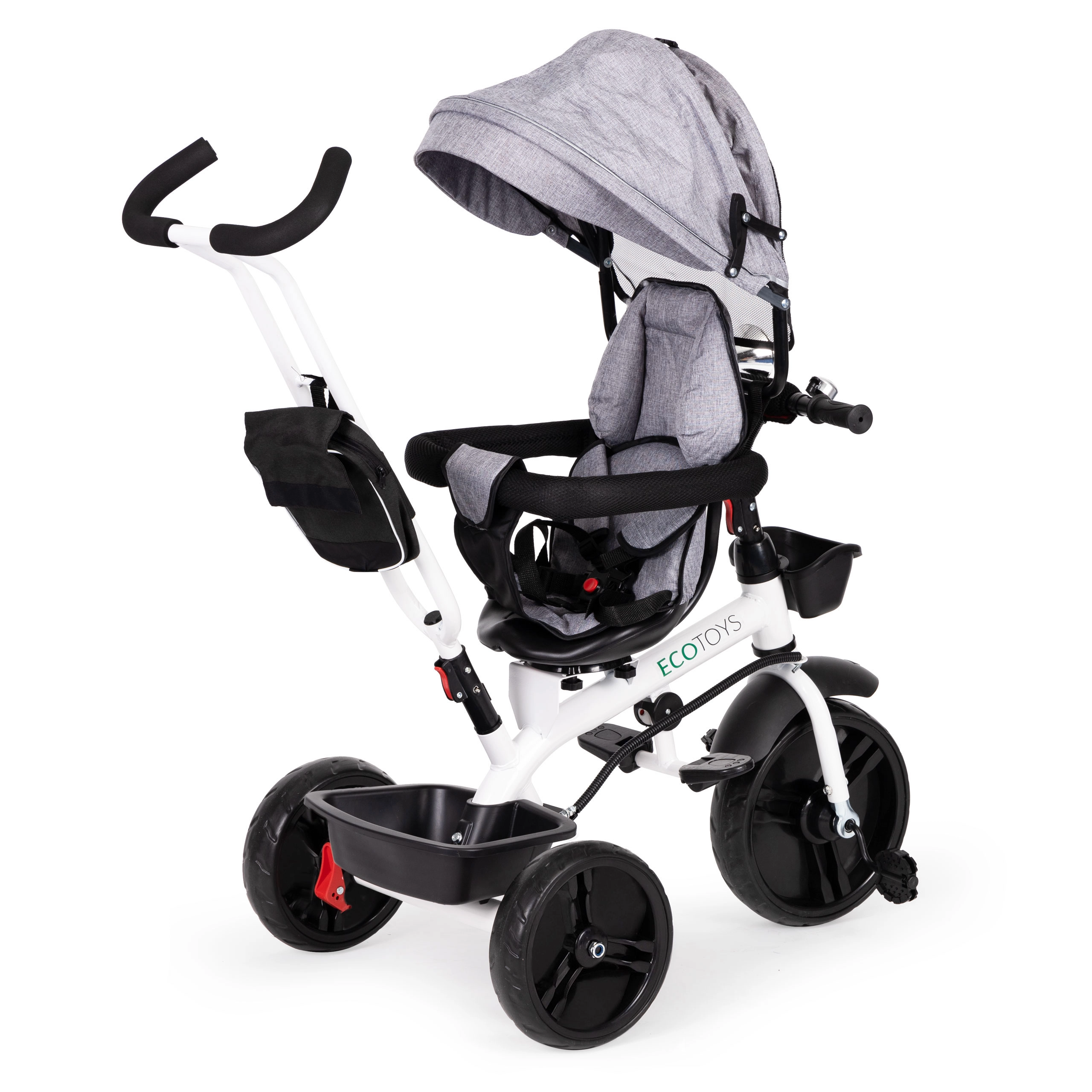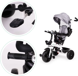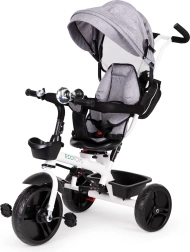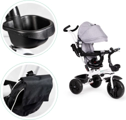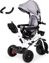 Šis multifunkcionālais trīsritenis aug kopā ar jūsu bērnu: no režīma ar vecāku vadību līdz pat patstāvīgai braukšanai. 360° rotējošais sēdeklis ļauj iestatīt pozīciju ar skatu pret vecāku labākam kontaktam vai braukšanas virzienā ziņkārīgiem pētniekiem. Polsterēts sēdeklis, 5 punktu drošības josta un aizsargrokturis sniedz drošības sajūtu, bet regulējams jumtiņš pasargā no saules un viegla lietus.