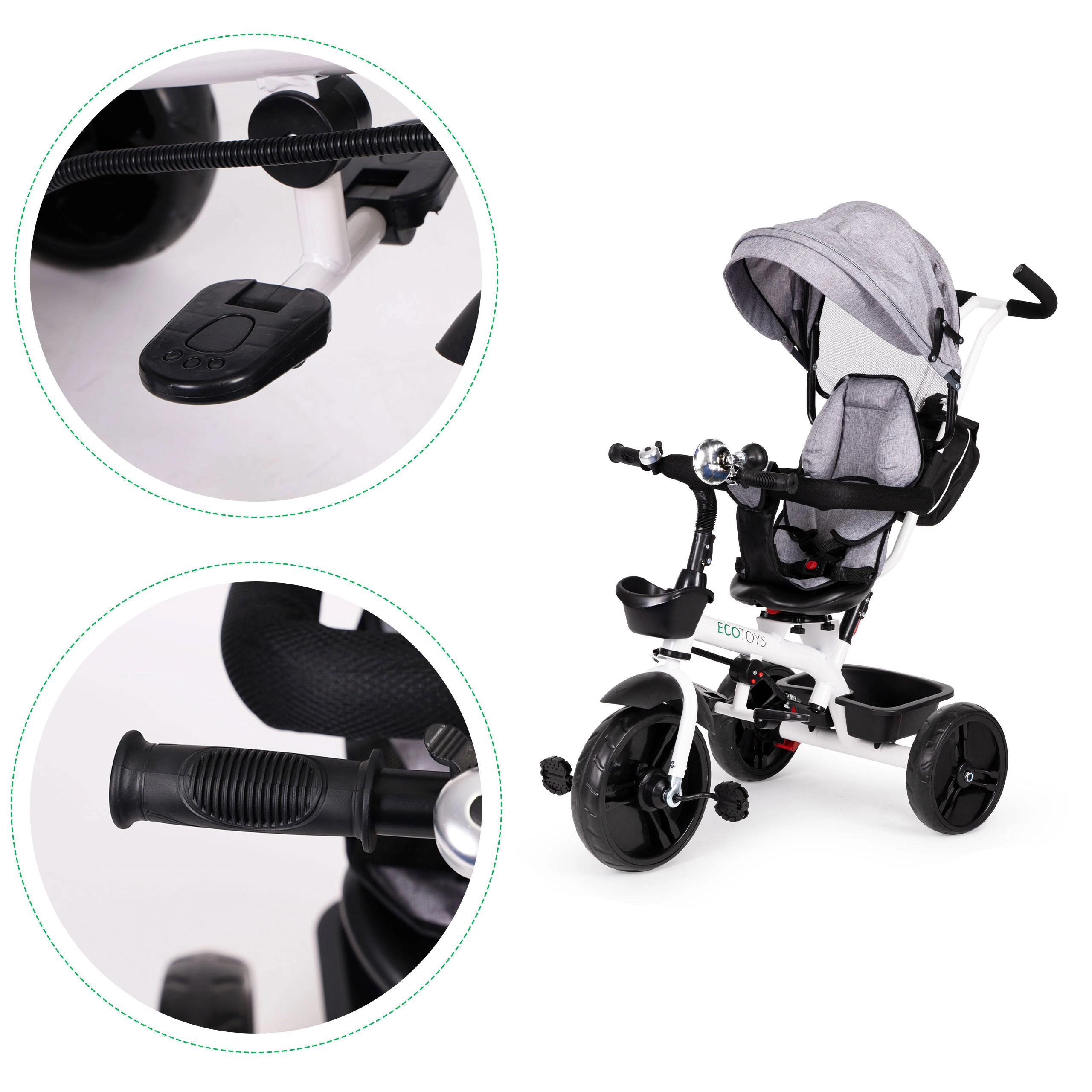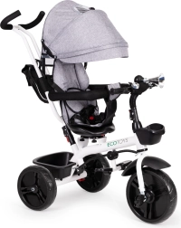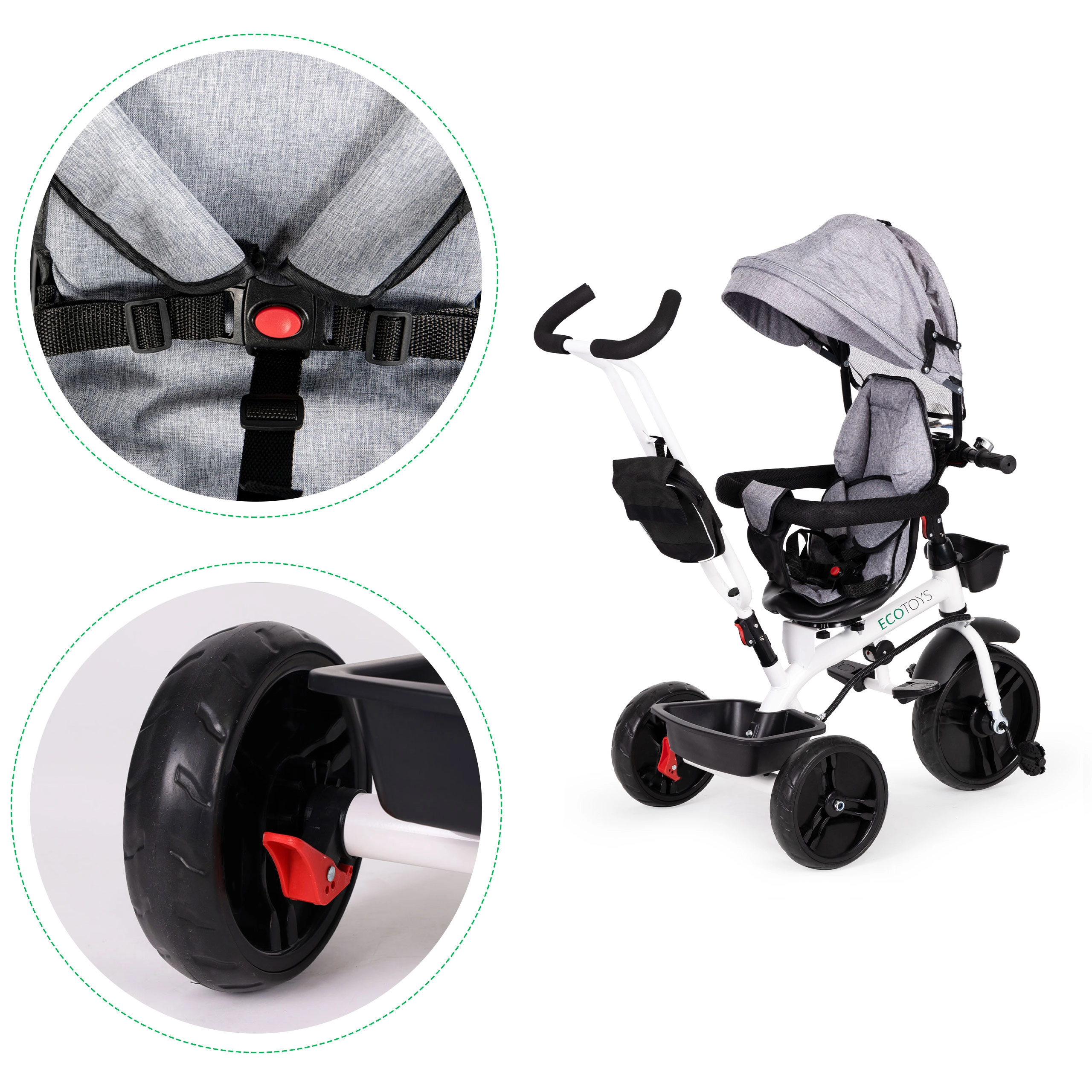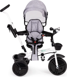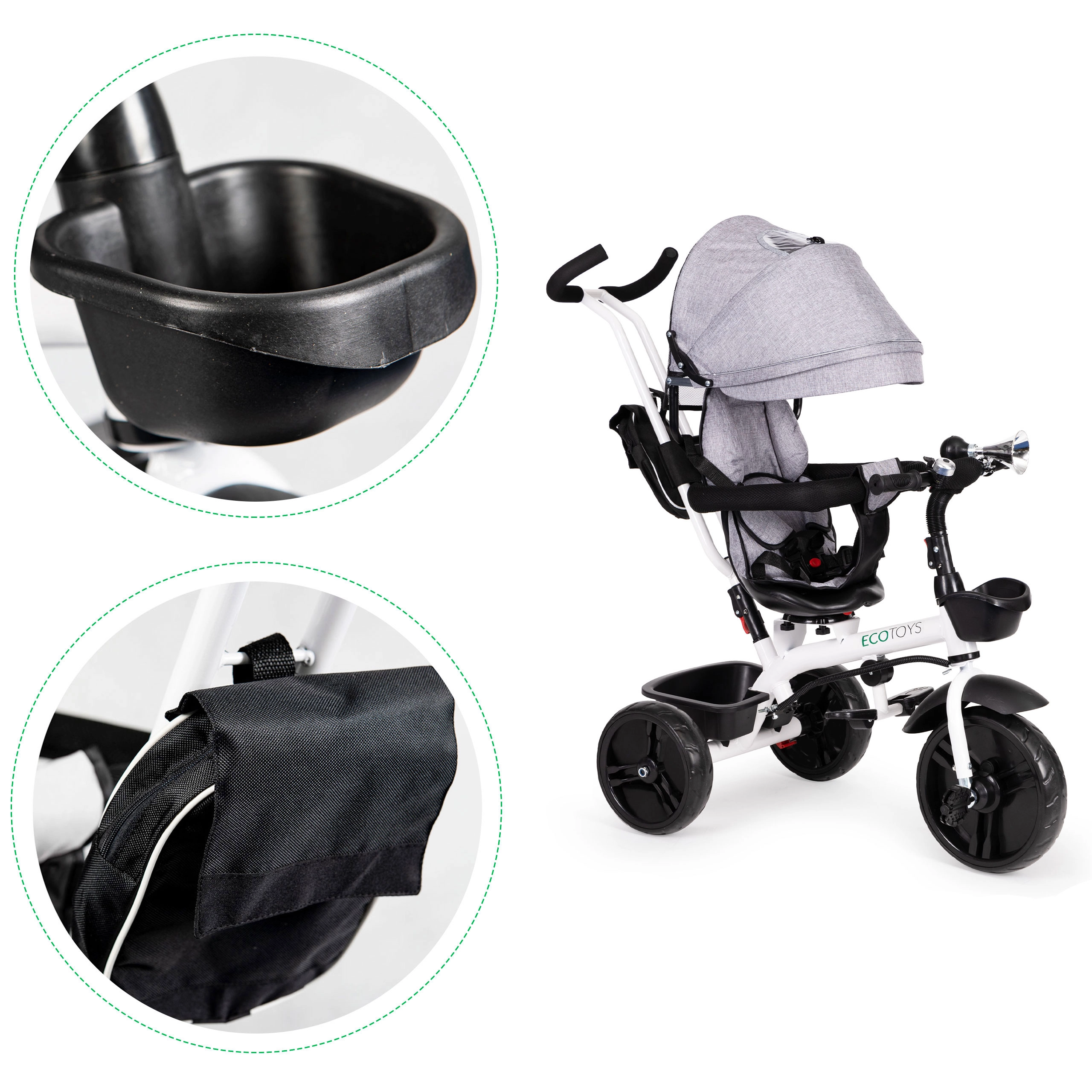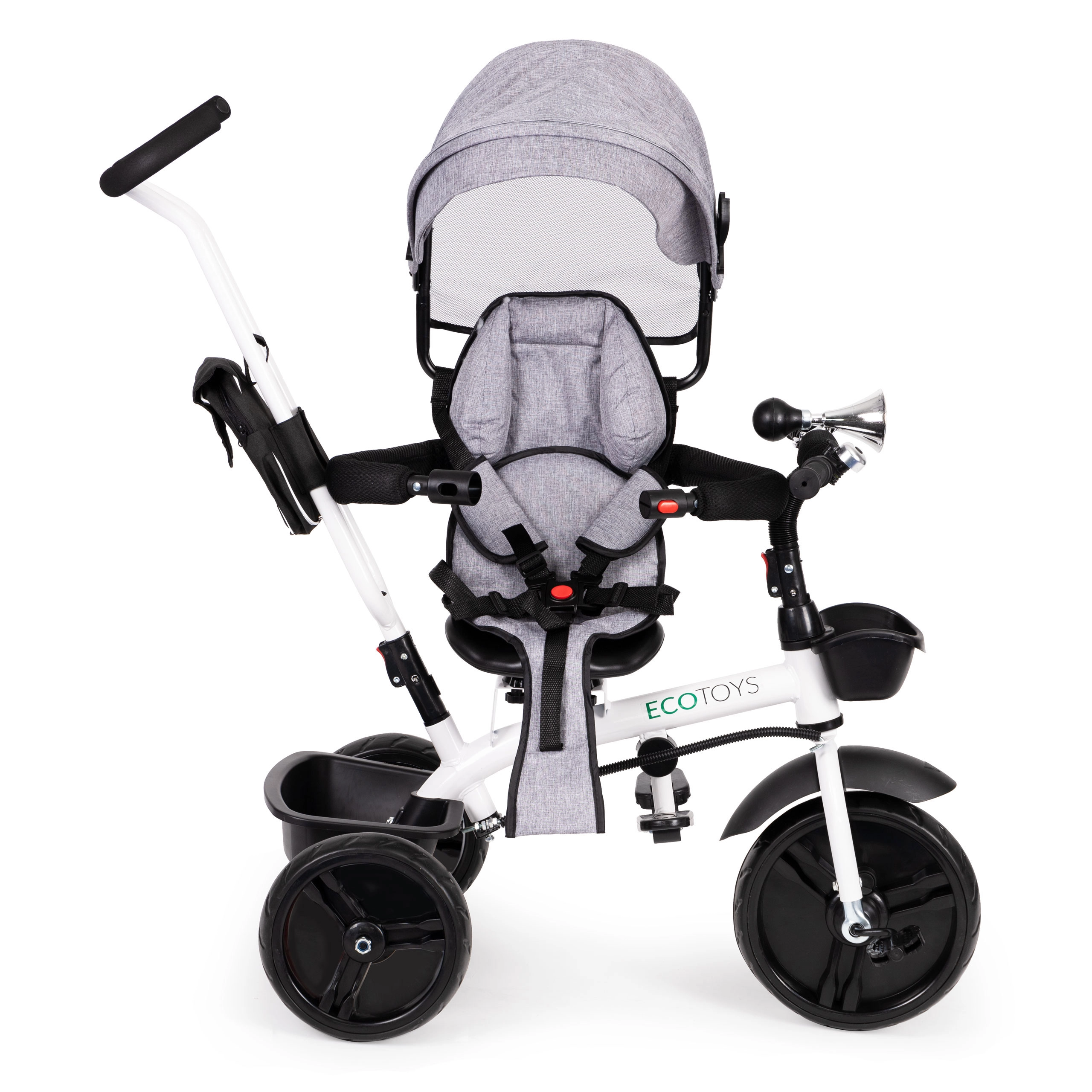 Šis multifunkcionālais trīsritenis aug kopā ar jūsu bērnu: no režīma ar vecāku vadību līdz pat patstāvīgai braukšanai. 360° rotējošais sēdeklis ļauj iestatīt pozīciju ar skatu pret vecāku labākam kontaktam vai braukšanas virzienā ziņkārīgiem pētniekiem. Polsterēts sēdeklis, 5 punktu drošības josta un aizsargrokturis sniedz drošības sajūtu, bet regulējams jumtiņš pasargā no saules un viegla lietus.