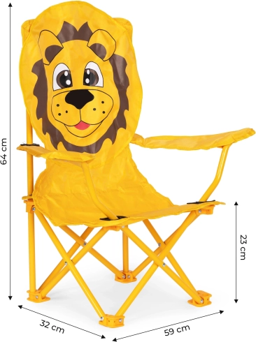 Piešķiriet bērniem viņu pašu ērtu vietu ikvienam piedzīvojumam. Bērnu saliekamais krēsls ar jautru lauvas sejas dizainu apvieno drošību, komfortu un izturību. Tērauda rāmis nodrošina stabilitāti, bet kvalitatīvs 600D poliestera pārvalks ar PU pārklājumu iztur lietu un sauli. Ideāli dārzam, pie ūdens, kempingā un piknikā.