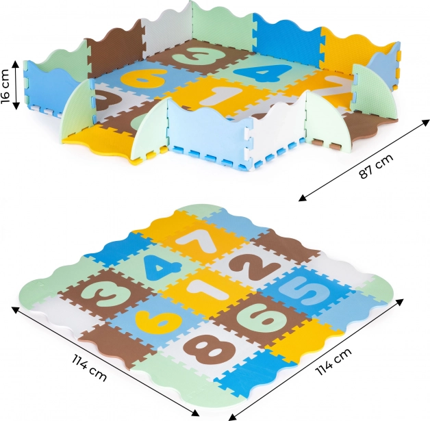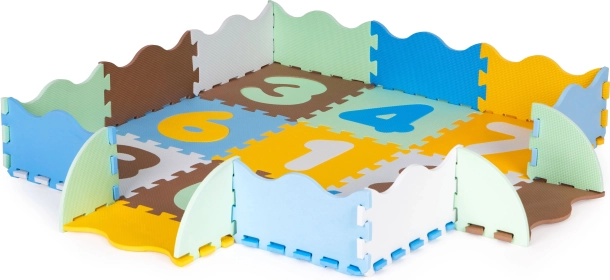 Elementi saliekas kā puzle un ļauj izveidot dažādas formas un praktisku nožogojumu, kas neļauj rotaļlietām izripot ārpus zonas. Izņemamie cipari veicina vizuālo mācīšanos, sīkās motorikas un iztēles attīstību – no daļām var veidot arī vienkāršas 3D konstrukcijas, piemēram, kubus vai torņus.