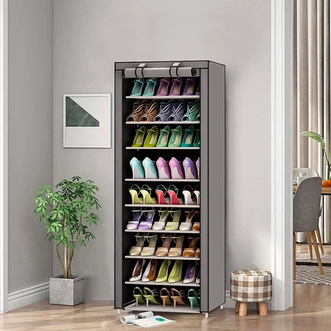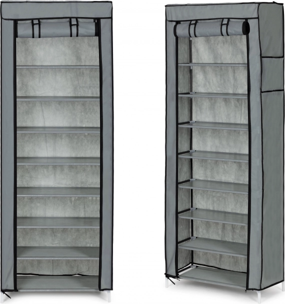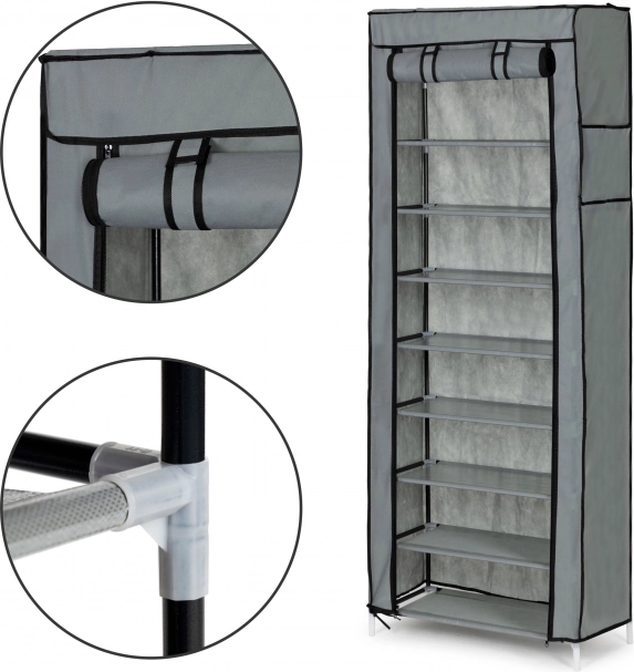 Stabilu konstrukciju nodrošina metāla cauruļu karkass ar plastmasas savienotājiem. Plaukti no izturīga tekstila ir nostiepti starp caurulēm, kas piešķir stingrību un ļauj ērti un pārskatāmi uzglabāt. Pateicoties attālumam starp plauktiem apmēram 15 cm, jūs viegli sakārtosiet gan apģērbu, gan apavus.