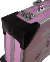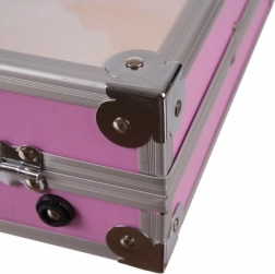 Rozā koferītis ar metāla malām, stūriem un aizdares mehānismiem uztur kārtību un aizsargā piederumus pārvadāšanas laikā mājās un ceļā.
