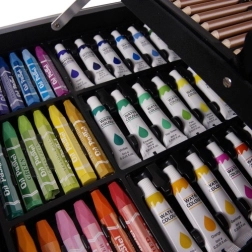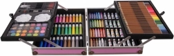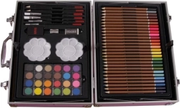 28× krāsainie zīmuļi, 33× flomāsteris, 24× eļļas pastelis, 24× akvareļu krāsa, 24× akrila krāsa, 2× dzēšgumija, 2× paletīte, 2× zīmulis, 4× ota, 1× asināmais, 1× koferītis