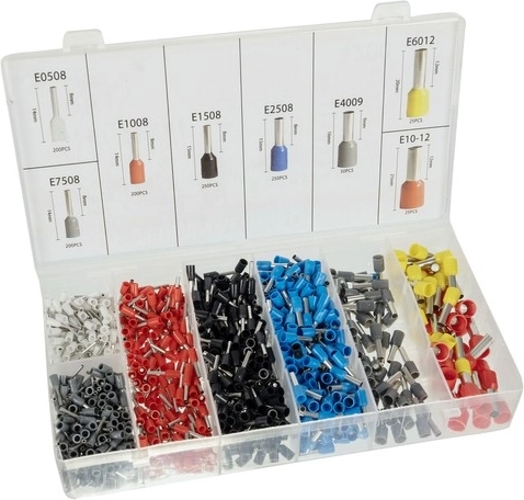 Iepakojumā atradīsiet praktisku caurspīdīgu organizētāju ar 1200 tukšgaļiem astoņos krāsu marķētos izmēros no 0,50 līdz 10,00 mm², lai pareizais izmērs vienmēr būtu pa rokai. Knaibles piemērotas gan profesionāļiem, gan mājas meistariem, un noderēs montāžas un servisa elektrodarbiem.