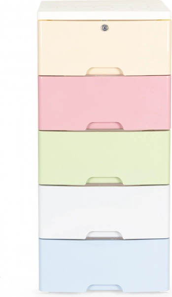 Uzturiet kārtību stilīgi un bez piepūles. Pārvietojamais plaukts ar piecām krāsainām atvilktnēm ir lielisks rotaļlietām, kosmētikai un sīkajiem piederumiem. Pateicoties stingrajai plastmasas konstrukcijai un stabilajam rāmim, tas ir piemērots bērnu istabai un vannasistabai, kur novērtēsiet vienkāršu kopšanu un tīru, modernu dizainu.